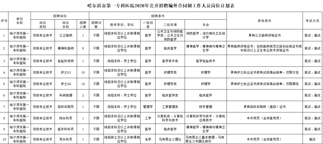 此次公开招聘编外合同制工作人员共计51人。具体招聘岗位、人数、条件等详见《2026年哈尔滨市第一专科医院公开招聘编外合同制工作人员计划表》(以下简称《招聘计划表》附件)。