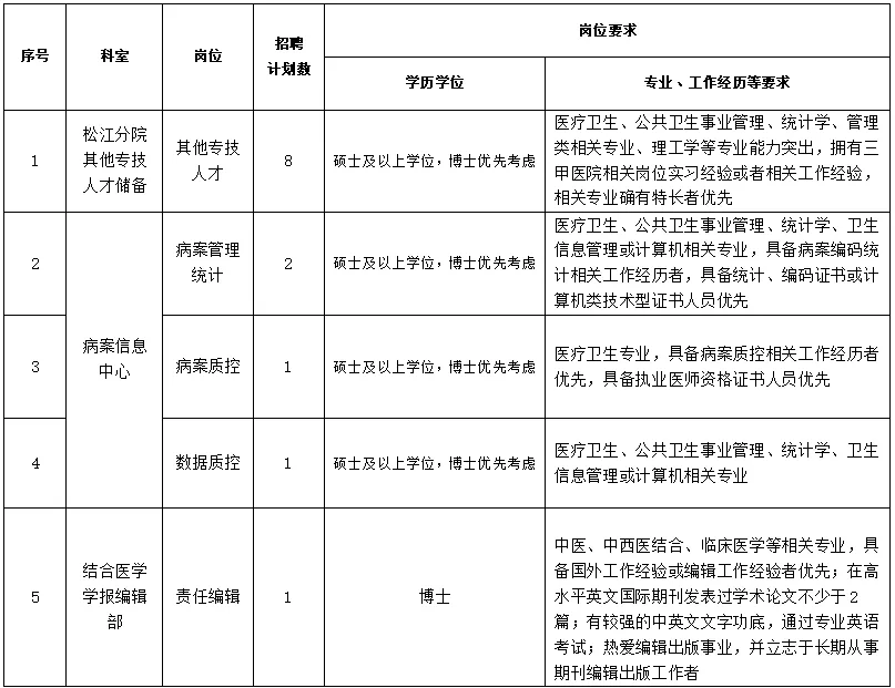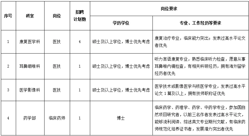现为了适应医院业务发展的需要,拟向社会公开招聘以下专业技术人才: