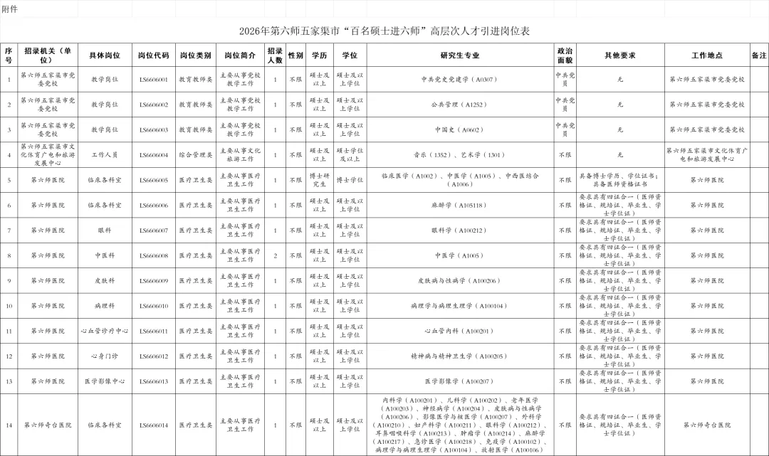 本批共14个岗位拟引进15人,涵盖教育教师、文化旅游、医疗卫生领域。具体岗位及要求详见《2026年第六师五家渠市“百名硕士进六师”高层次人才引进岗位表》(以下简称“岗位表”)。