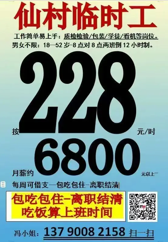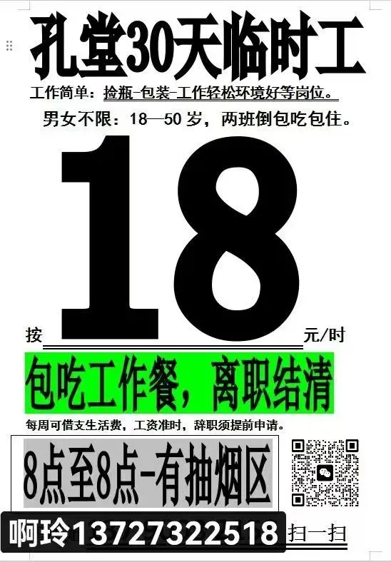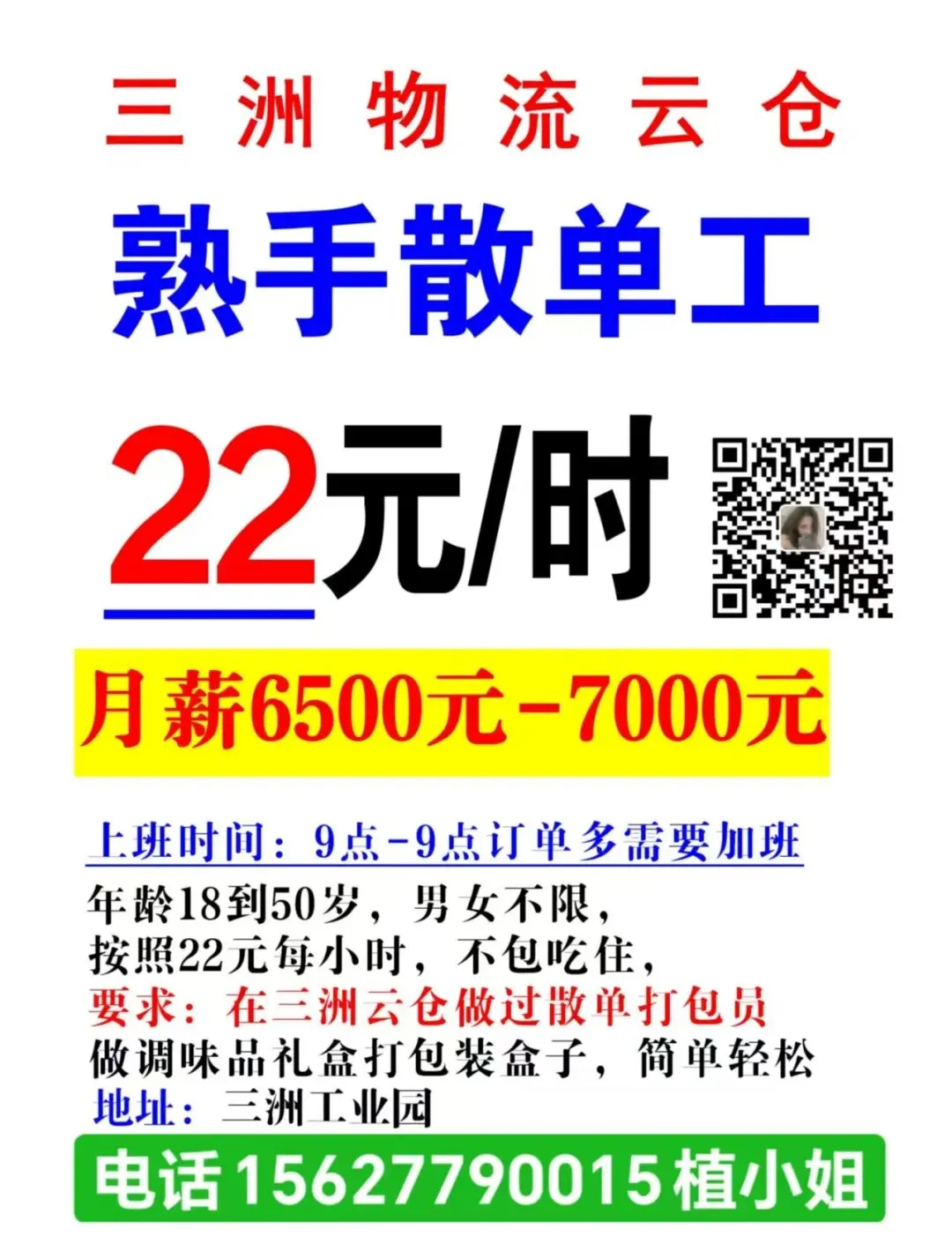 招聘岗位: 包装临时工、包装普工招聘人数: 包装临时工1人,包装普工1人薪资待遇: 包装临时工160-180元/天,包装普工4000-6000元/月岗位要求: 负责包装车间柜子以及配件的包装工作;服从工作安排福利: 包吃包住,长白班,购买社保,每年加薪,晋升发展空间大;夫妻租房补贴每人每月150元;宿舍有空调、无线WIFI、热水器;生日、节日福利,工资准时发放联系方式: 联系人:曾小姐(18022253181) 刘小姐(13928902729)(微信同号) 单位地址:更合镇小洞工业区