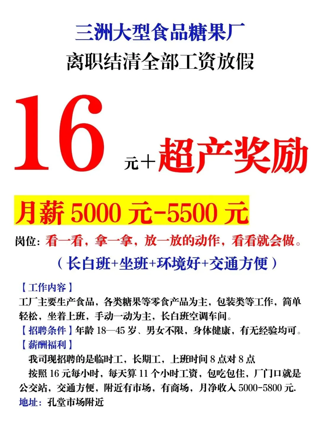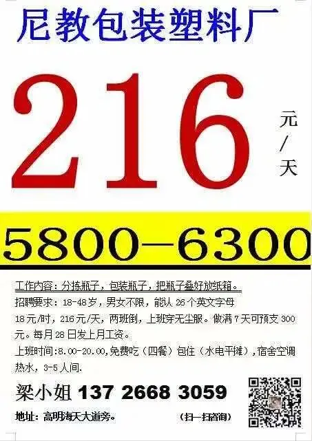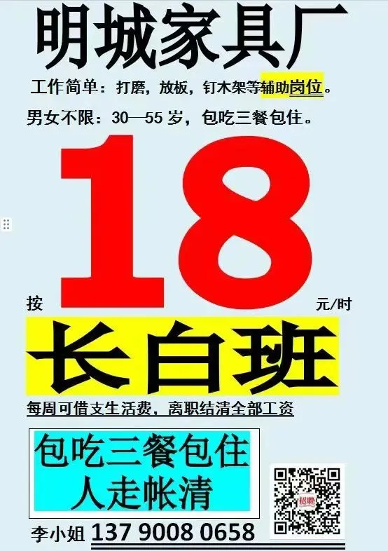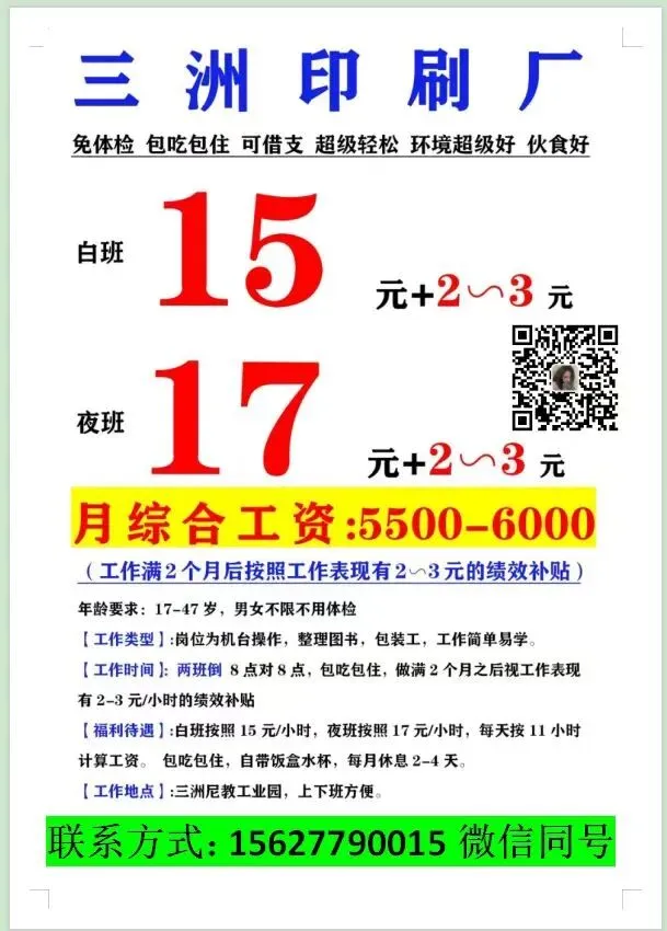 招聘岗位: 车间作业员、包装工招聘人数: 车间作业员3人,包装工2人薪资待遇: 车间作业员4500-7000元/月,包装工4500-5500元/月岗位要求: 工作认真细致,服从工作安排,能接受加班;服从工作安排,接受加班福利: 能接受夜班,星期日休息;包吃住,水电费自理;工资4500元+补贴,加班另计;全日班8小时制,星期日休息,加班另计联系方式: 联系人:谭小姐 联系电话:18927291897 地址:更合镇小洞工业区雅力思公司内车间一