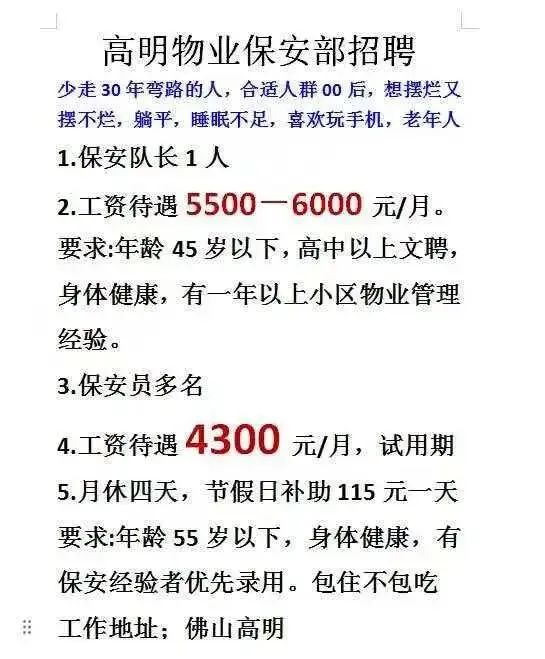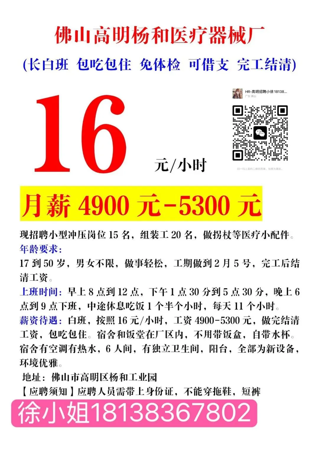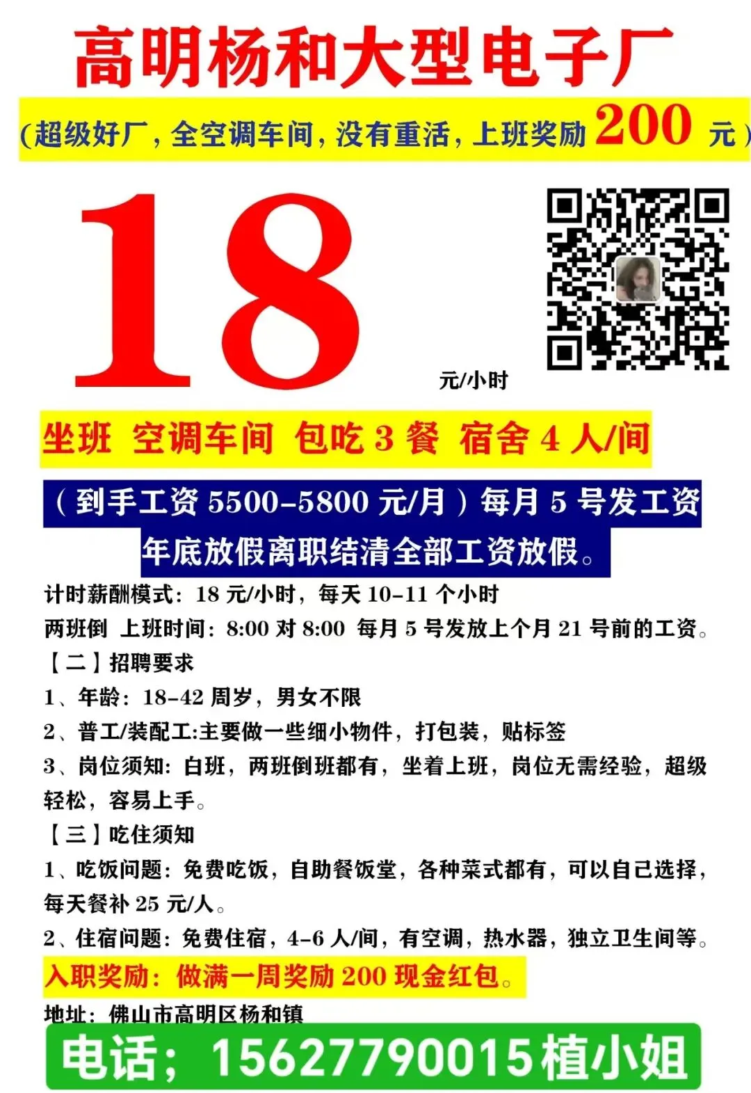 招聘岗位: 跟单文员、生产普工、机电工、工艺喷油、中控员、开机手/膨化、叉车司机、成品仓管、原材料仓管、会计、会计(需要在高明市区上班)、喷涂枪手、搬运工、机器操作工、普工招聘人数: 跟单文员1人,生产普工6人,机电工3人,工艺喷油1人,中控员1人,开机手/膨化1人,叉车司机2人,成品仓管1人,原材料仓管1人,会计2人,喷涂枪手1人,搬运工1人,机器操作工1人,普工5人薪资待遇: 跟单文员4500-5500元/月,生产普工6000-8000元/月,机电工6500-8000元/月,工艺喷油6000-8000元/月,中控员6500-8000元/月,开机手/膨化6500-8000元/月,叉车司机6000-8000元/月,成品仓管4000-5000元/月,原材料仓管4000-4500元/月,会计4000-6500元/月,喷涂枪手30元/小时,搬运工21元/小时,机器操作工5000-6000元/月+加班工资,普工17-19元/小时岗位要求: 中专或高中以上学历,熟练使用办公软件;负责全厂用电作业、设备维修等福利: 发薪准时(每月18日准时发放,逢周六日顺延);入职购买社保,住房公积金;提供住宿,配备空调、热水、WIFI;入职满3个月全额报销职业体检费用;提供节假日礼品等联系方式: 联系人:邓生、谢小姐 联系电话:0757-88898991、13527075379 单位地址:更合镇金腾路1号