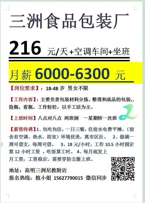 招聘岗位: 车间分装员招聘人数: 2人薪资待遇: 5000-9000元/月岗位要求: 计件,能接受旺季的时候上夜班,具有团队精神,对工作负责认真,服从工作安排福利: 月休4天,提供食宿,购买社保,转正后报销入职体检费用联系方式: 联系人:戴小姐 联系电话:15920586146、0757-88848939 单位地址:更合镇更合大道161号 乘车路线:高明汽车站乘坐501、506到美华工业中心站下车