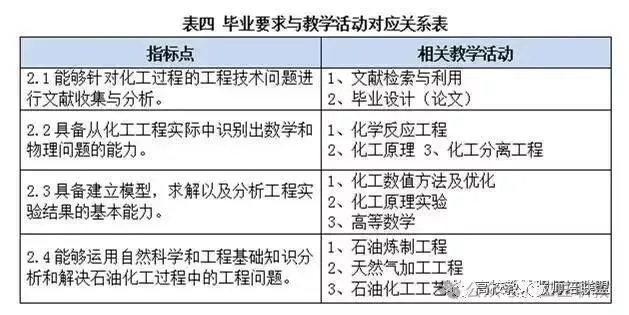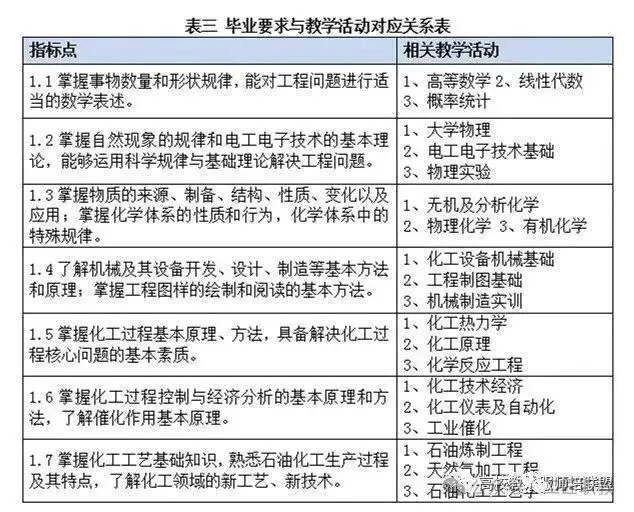 案例三:环境工程专业课程体系与毕业要求矩阵(见附表三)(四)毕业要求与教学环节之间的对应关系毕业要求是通过教学环节实现的。毕业要求可分解成若干个指标点,每个指标点需有若干个教学环节作为支撑。比如,在工程专业论证通用标准中,毕业要求有12方面,每个毕业要求都可以拆分成多个指标点,每个指标点再通过若干教学环节提供支撑。以化学工程与工艺专业为例:毕业要求1:工程知识:能够将数学、自然科学、工程基础和专业知识用于解决复杂工程问题。