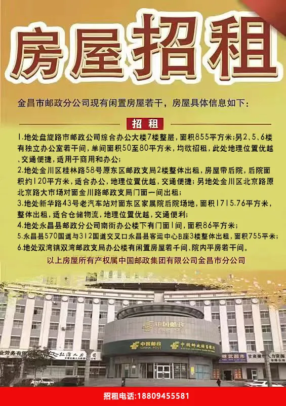 金昌市邮政分公司有闲置房屋若干,现面向社会招租,房屋具体信息如下:
