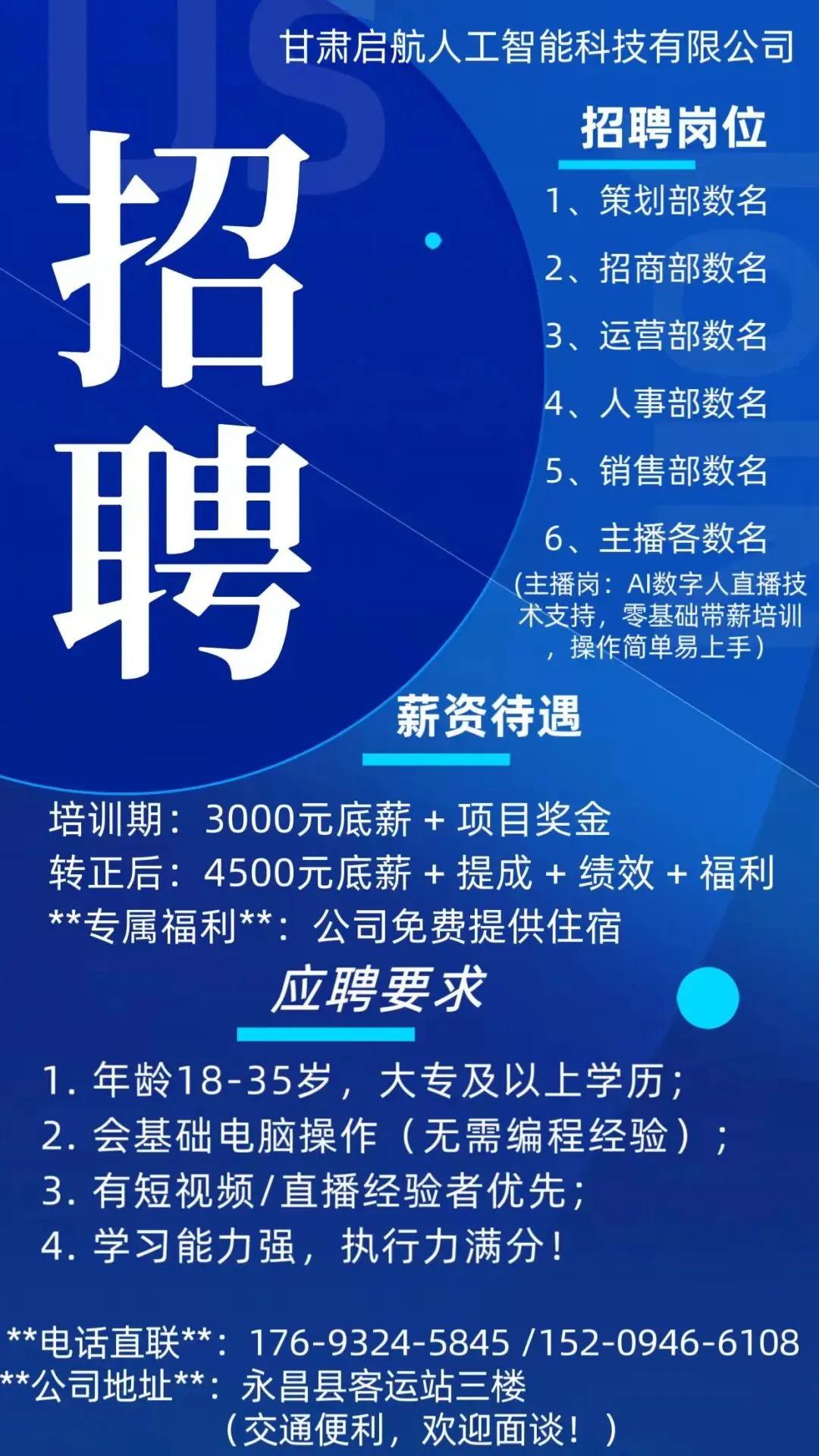 永昌县客运站三楼甘肃启航人工智能科技有限公司因业务需要招聘岗位若干名: