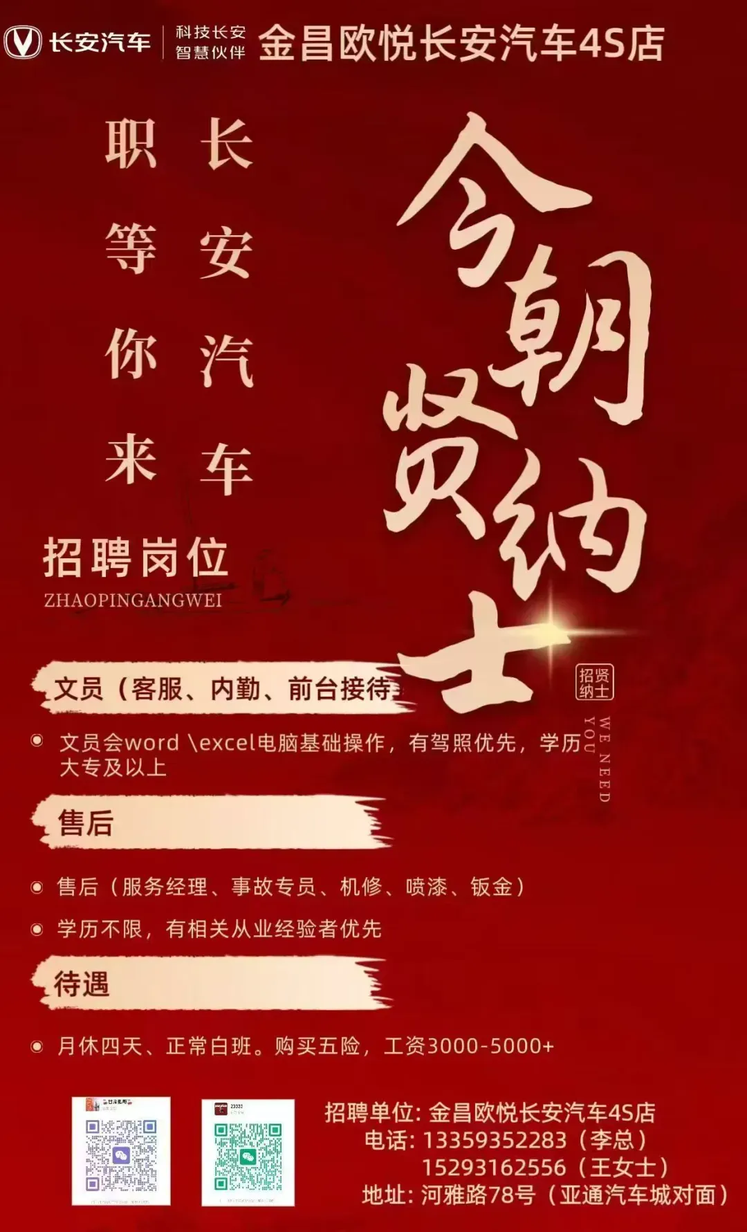 河雅路欧悦长安汽车店因业务需要招聘办公室文员、售后专员,有相关工作经验优先。