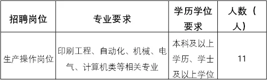 生产操作岗位11人,印刷工程、自动化、机械、电气、计算机类等相关专业。