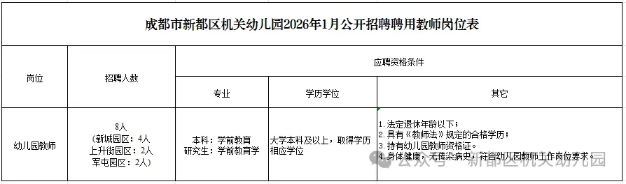 原标题:【招聘公告】成都市新都区机关幼儿园2026年面向社会公开招聘聘用教师公告