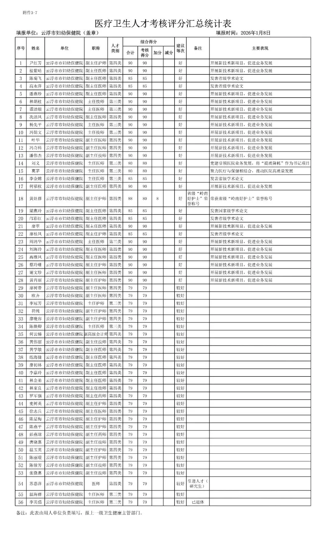 根据《中共云浮市委关于推进人才云聚强市工程的意见》《关于开展云浮市人才分类考核评估及相关单位人才工作责任考核 的指导意见(试行)》《医疗卫生人才综合考核评估工作方案》精神,经个人自评、综合评议等程序,我院医疗卫生人才综合考核评估名单如下,现予以公示。