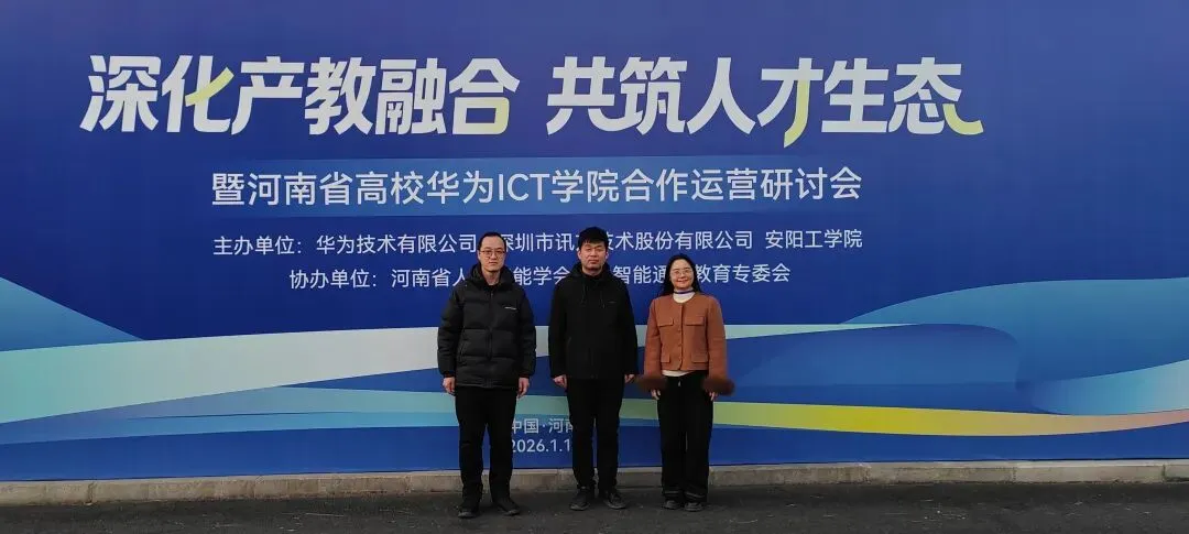 2026年1月10日,由华为技术有限公司、深圳市讯方技术股份有限公司联合主办,安阳工学院承办的“深化产教融合·共筑人才生态暨河南省高校华为ICT学院合作运营研讨会”在安阳工学院隆重举行。商丘学院高度重视此次交流机会,派出了由计算机工程学院(AI学院)院长助理张正阳、实验室主任王凯、物联网工程教研室主任唐娴组成的代表团前往参会,共同探讨ICT人才培养与产教融合新路径。