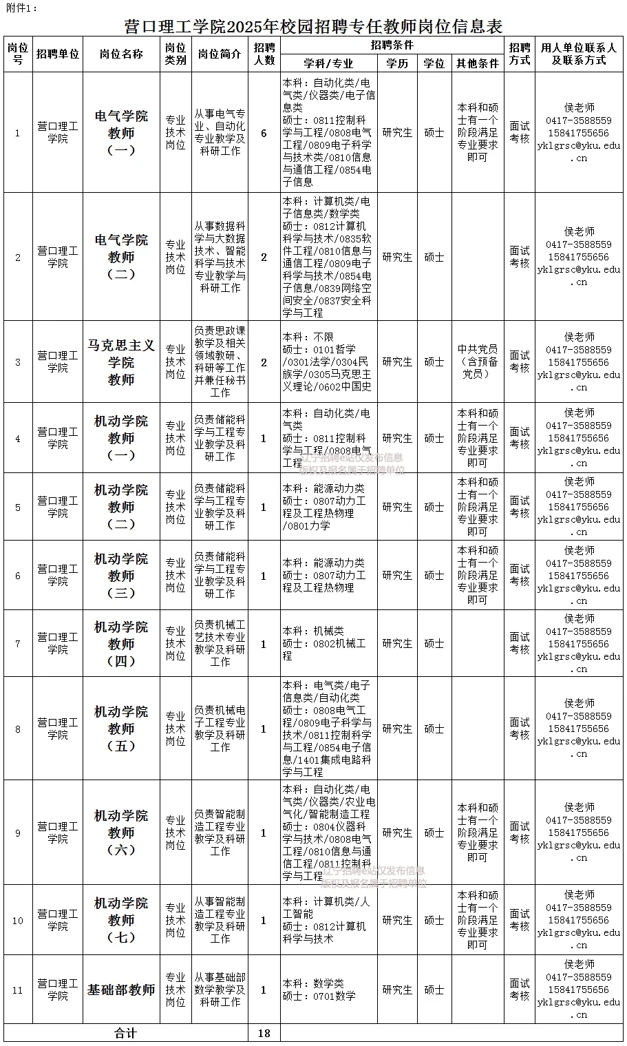 附件1:营口理工学院2025年校园招聘专任教师岗位信息表(见下图)