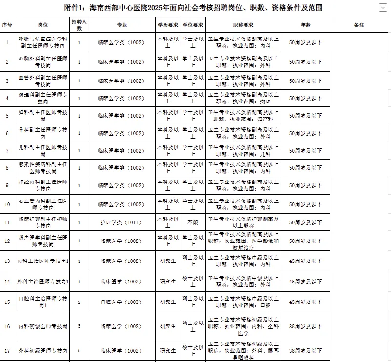 海南西部中心医院面向社会考核招聘编内专业技术人员的公告