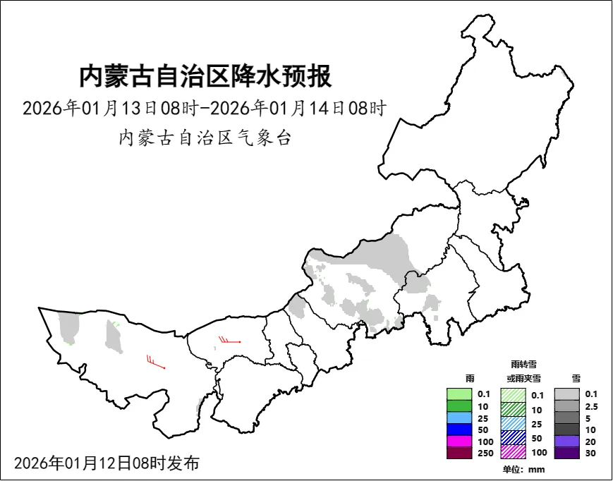13日08时至14日08时,阿拉善盟西北部、乌兰察布市北部、锡林郭勒盟西部和中部部分地区、赤峰市西部多云,有分散性小雪;西部大部、中部偏西、东部偏东地区有5、6级短时7、8级局地9级偏西风,西部偏西和偏北局地伴有沙尘天气。