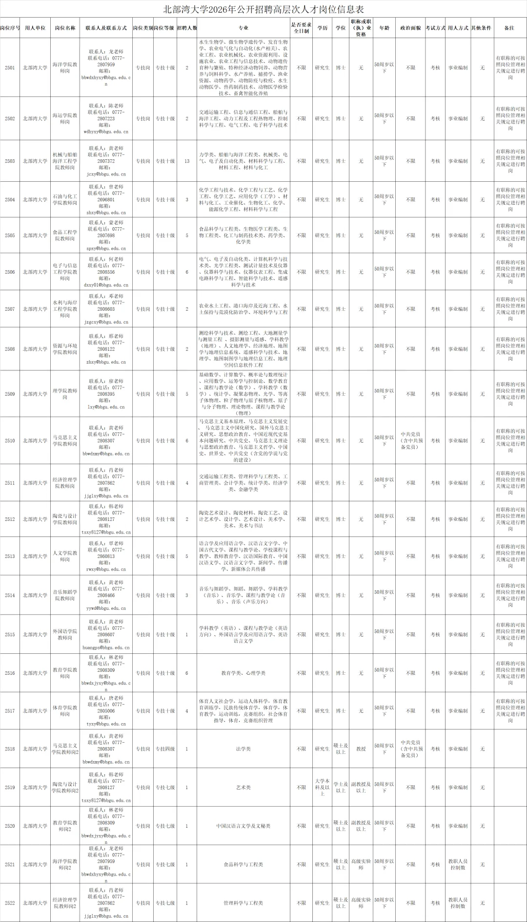 本次公开招聘高层次人才76名,具体岗位要求见《北部湾大学2026年公开招聘高层次人才岗位信息表》(附件1)。