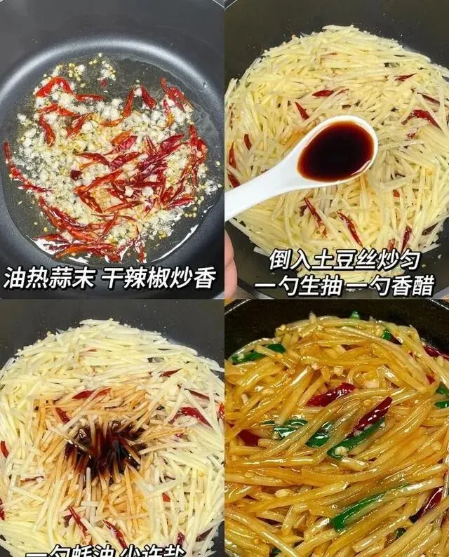 切完先泡水 , 去淀粉 , 不然粘锅。 炒的时候顺着锅边淋点醋 , 脆得很 , 这招我试过 , 真的管用。