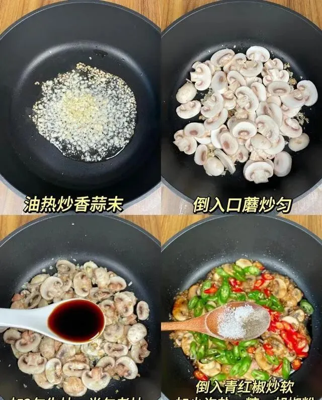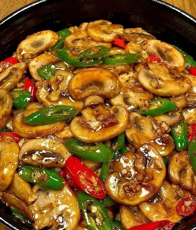 热锅凉油 , 蒜末爆香 , 菌菇煎出金黄边 , 淋料汁 , 炒匀出锅 , 香得邻居都来敲门问你做啥好吃的。