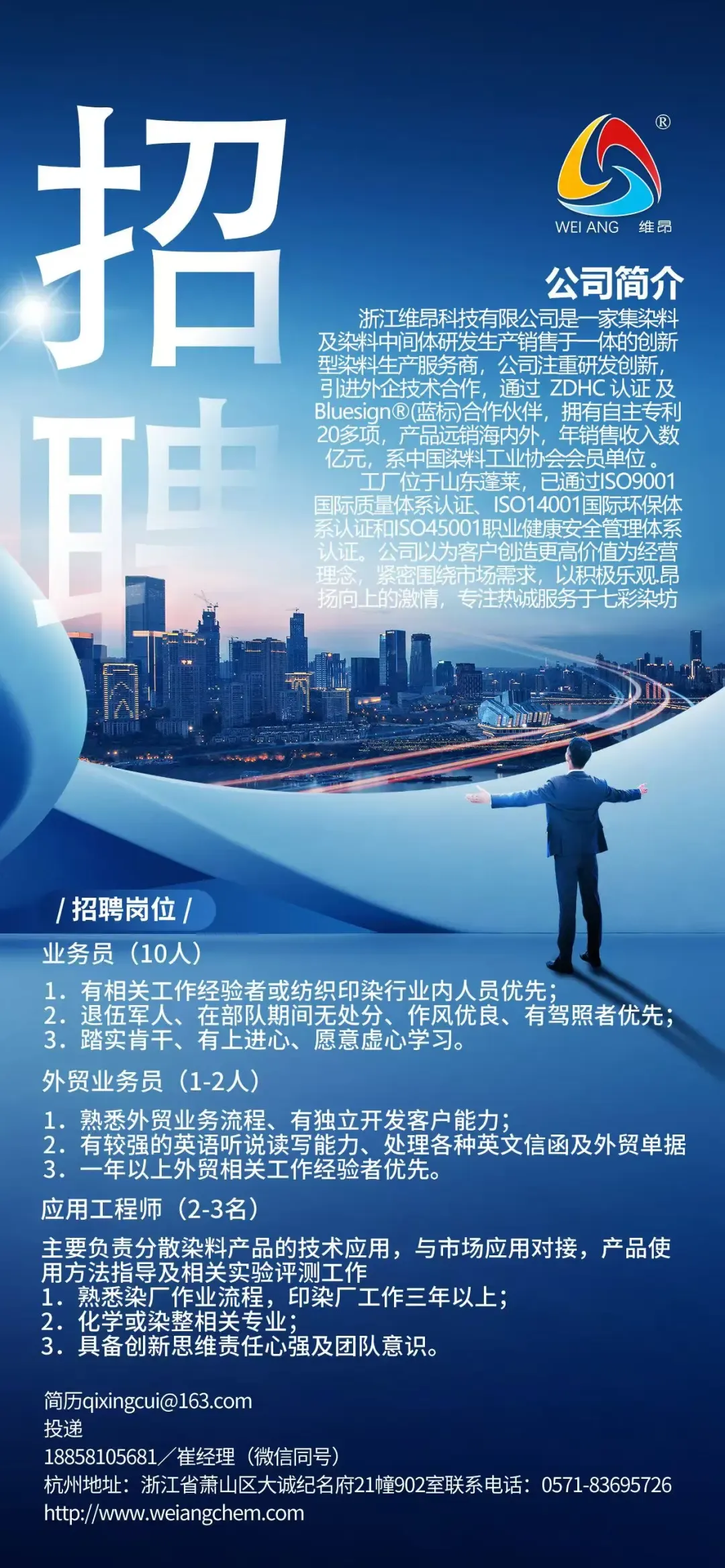 学历与专业: 纺织化学与染整工程或相关专业,本科及以上学历。
