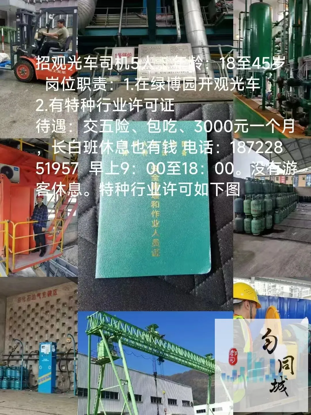 置顶贵州省在盛年旅游开发有限责任公司招观光车司机5人。年龄:18至45岁 岗位职责:1.在绿博园开观光车2.有特种行业许可证待遇:交五险、包吃、3000元一个月,长白班休息也有钱。 早上9:00至18:00。没有游客休息。面试电话:,面试微信chen187****1957。面试地点:绿博园河北园。注:请注意看面试地点。面试之前先打电话联系人:真**好