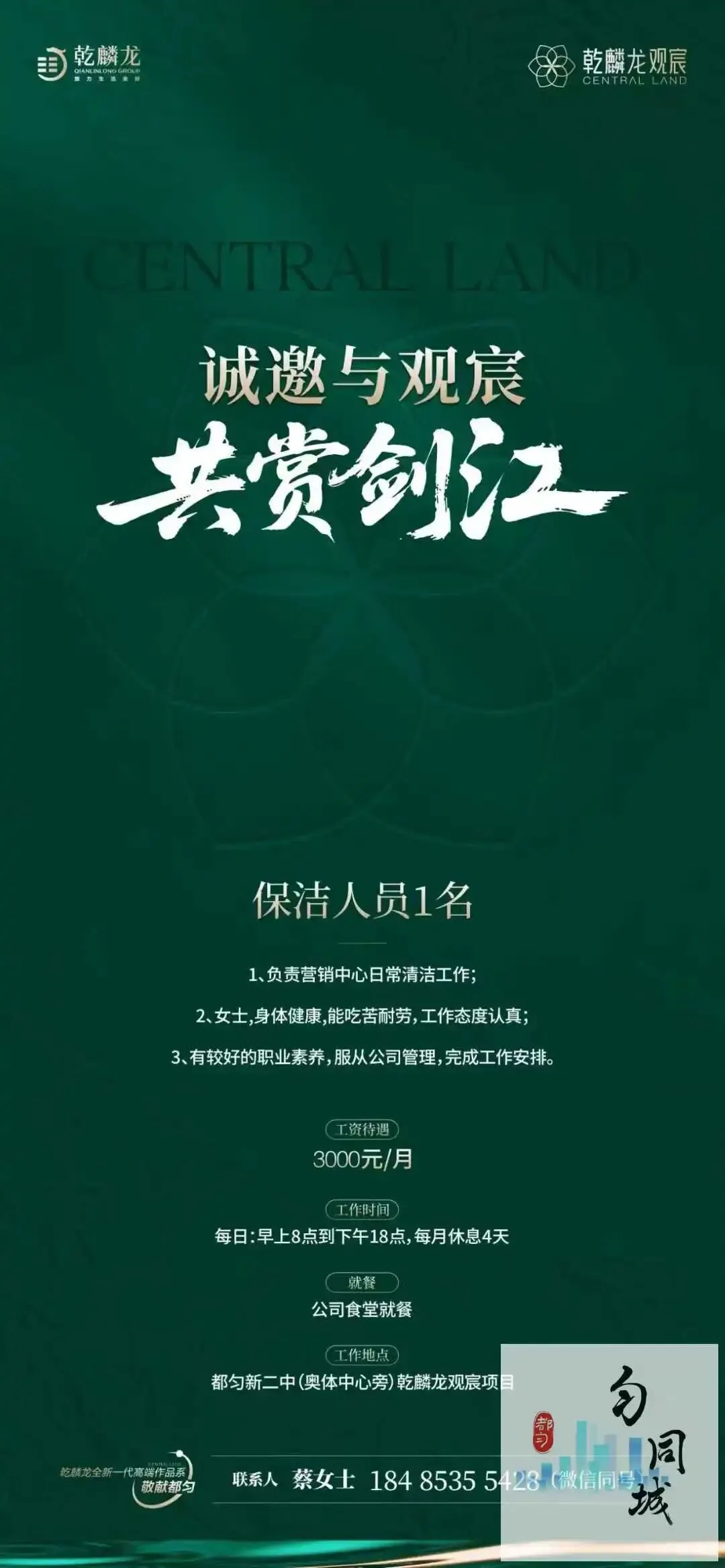 招聘:保洁一名工资待遇:3000元/月工作地点:都匀新二中(奥体中心旁)乾麟龙观宸项目联系人:蔡萍联系人:蔡萍