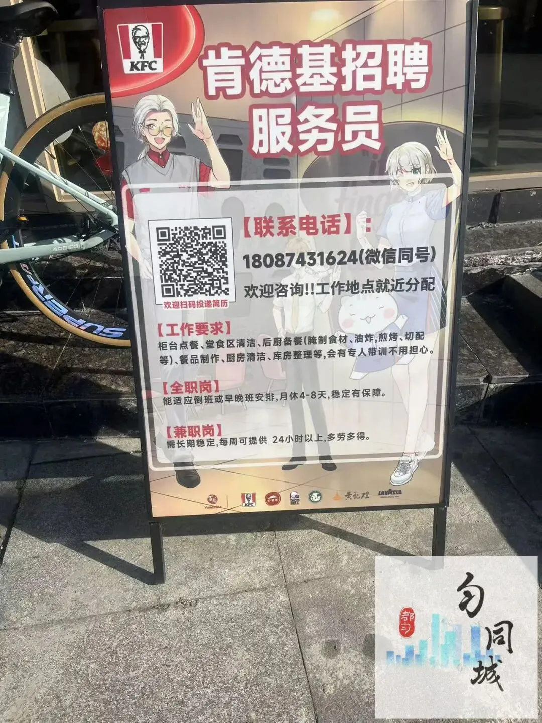 KFC肯德基招聘服务员[联系电话]:(微信同号)欢迎咨询!!工作地点就近分配欢迎扫码投递简历[工作要求]柜台点餐,堂食区清洁,后厨备餐(腌制食材,油炸,煎烤,切配等),餐品制作,厨房清洁,库房整理等,会有专人带训不用担心。联系人:来**食