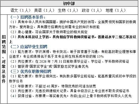 初中:语文、数学、英语、历史、地理、生物、音乐、体育、美术、道德与法治、心理健康、信息科技等学科教师。