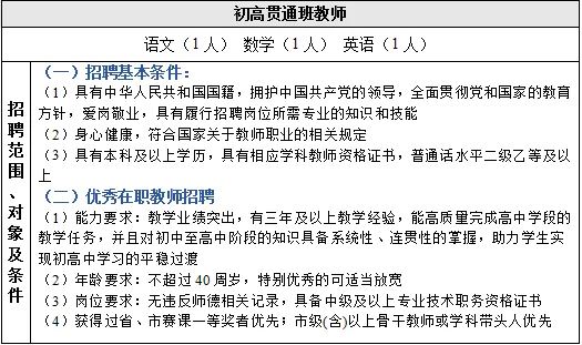 1. 拥护中国共产党的领导,全面贯彻党的教育方针。热爱祖国,热爱人民,热爱教育事业。具备相应学科的教师资格证,无师德师风失范情况,无违纪、违法记录。认同学校文化 ,服从学校工作安排。身心健康、乐观向上,充满正能量。具有良好的团队合作精神,学习能力强,工作认真负责。