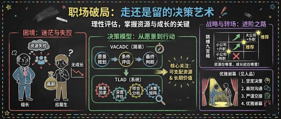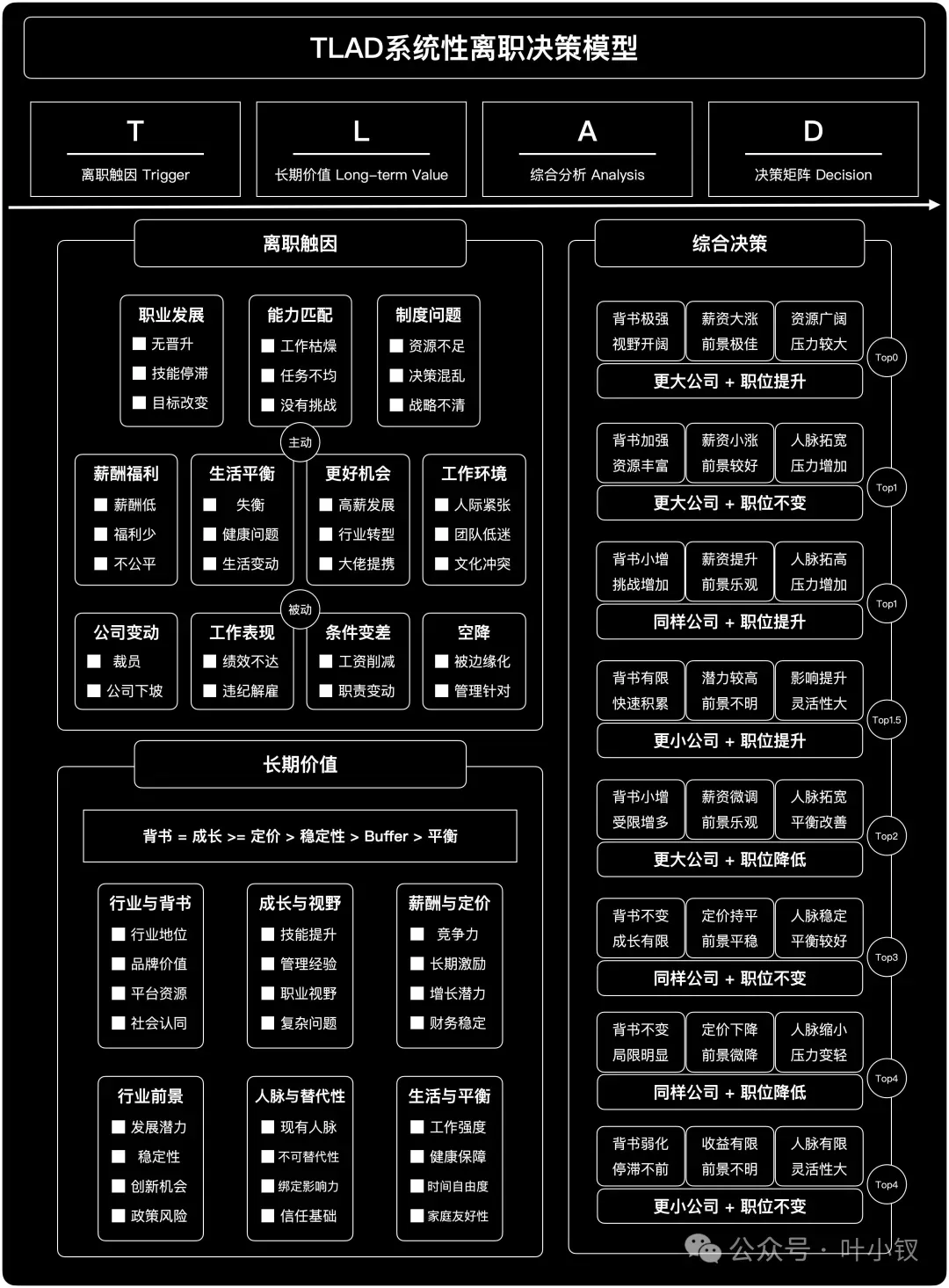 TLAD系统性离职决策模型提供了从触发因素到综合决策的全方位指导,帮助你从短期问题走向长期价值的思考: