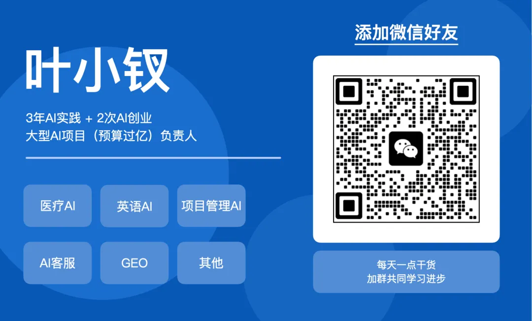 点击上方卡片关注叶小钗公众号,查看下方二维码,添加我个人微信:
