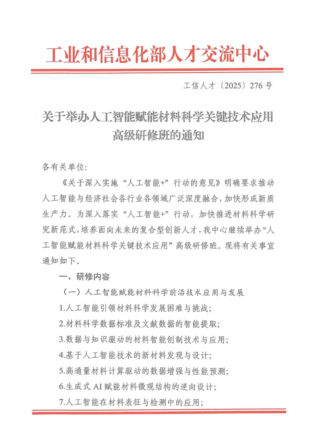 抢占AI+材料风口!在《关于深入实施“人工智能+”行动的意见》指引下,人工智能与各行业深度融合已成为催生新质生产力的核心引擎。材料科学作为工业制造、新能源、生物医药等领域的基础支撑,正面临数字化、智能化转型的关键机遇。为助力行业从业者紧跟技术前沿,培养复合型创新人才,工业和信息化部人才交流中心特推出“人工智能赋能材料科学关键技术应用”高级研修班,第八期课程已定档,诚邀各界精英共探行业新范式!