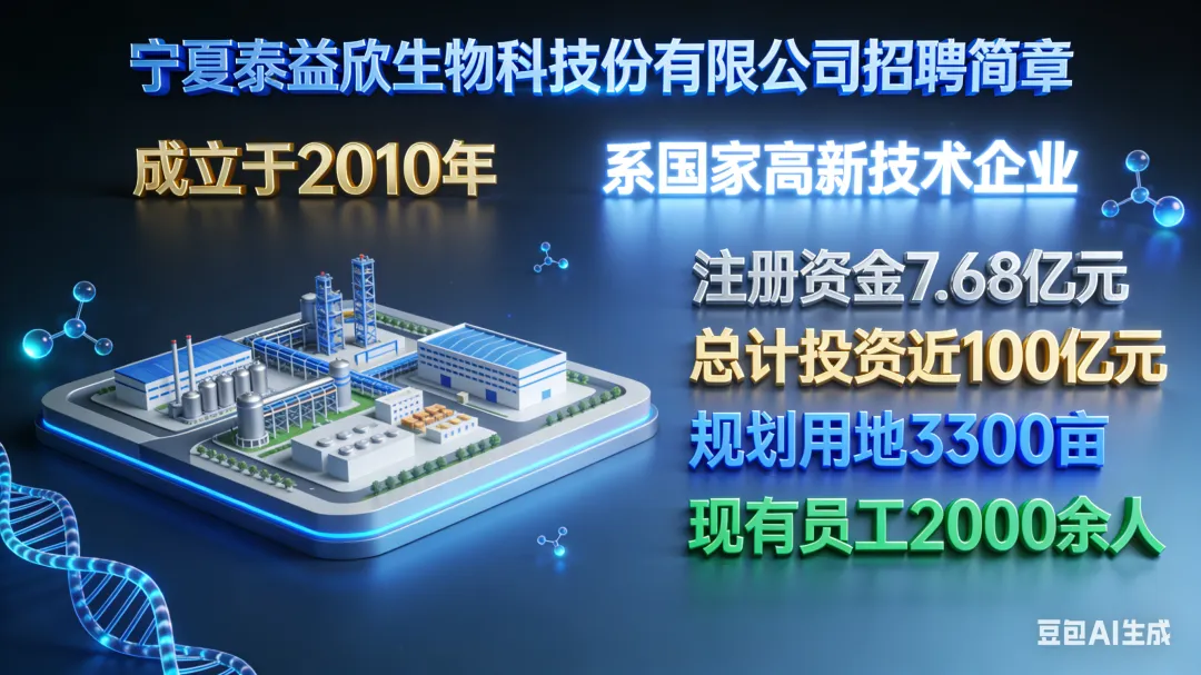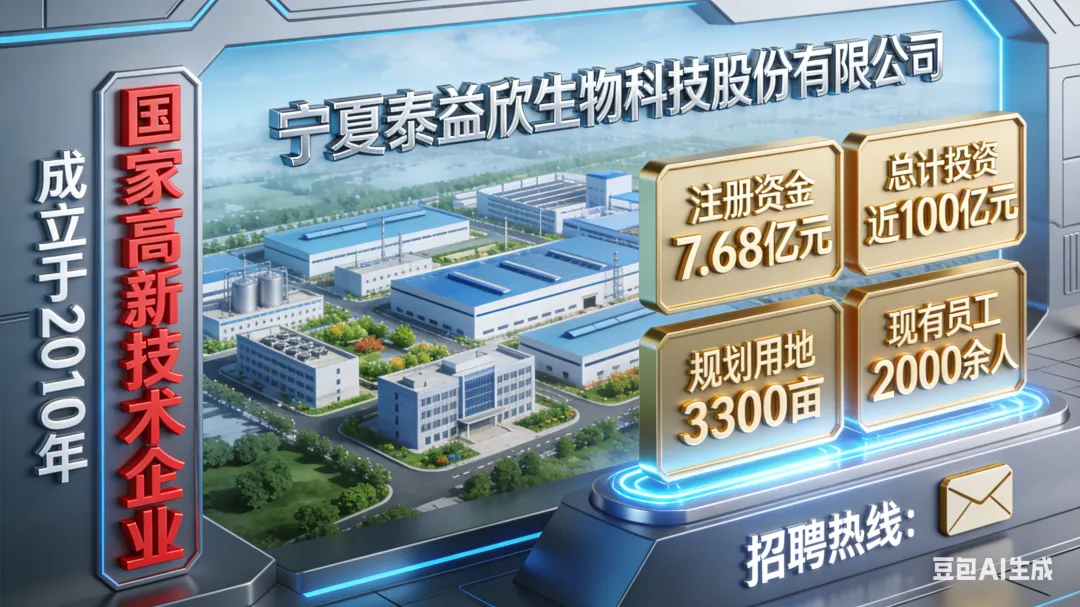 宁夏泰益欣生物科技股份有限公司成立于2010年,系国家高新技术企业,位于宁夏银川市贺兰工业园区。公司注册资金7.68亿元,总计投资近100亿元,规划用地3300亩,现有员工2000余人。