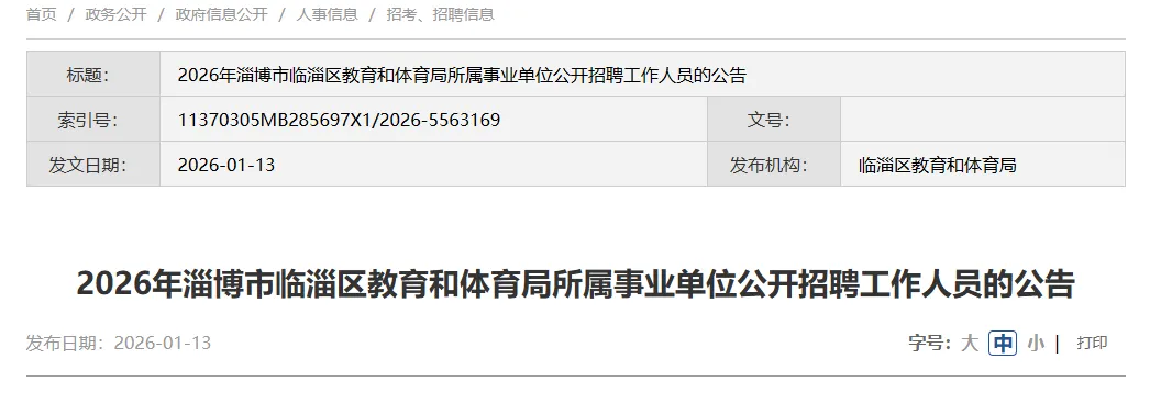 根据事业单位公开招聘有关规定,结合临淄区教育和体育局所属事业单位岗位空缺情况和工作需要,现将2026年度临淄区教育和体育局所属事业单位面向社会公开招聘工作人员的有关事项公告如下: