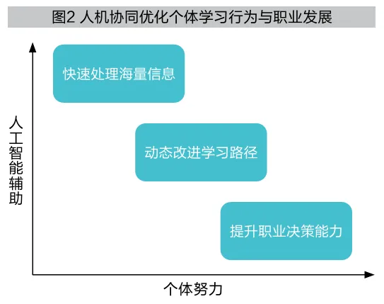 人机协同学习正在对职业发展过程产生长期影响(见图2)。首先,人机协同让职业技能学习事半功倍。AI能快速筛选海量信息,帮人们省去烦琐的查找过程;还能提供即时、精准的反馈,比如编程练习中的错误提示,帮助我们更快改进。其次,人机协同能根据个体的需求实时调整学习内容。AI会分析员工的学习进度,自动调整课程难度,确保所学内容与个体需求相符;AI还能监测市场趋势,及时推荐与新技能需求相关联的学习资源,帮助个体保持竞争力,强化持续学习习惯和职业敏捷度。最后,人和AI的深度融合为职业发展提供了创新动力。在解决复杂问题时,人类负责直觉和创意,AI负责数据计算,两者结合能做出更精准的决策。IBM的“人工智能技能学院”实践结果表明,经过这种人机协作训练的员工,往往能更快得到晋升,并能够胜任跨职能、多职能角色,为组织贡献更丰富的创新成果。