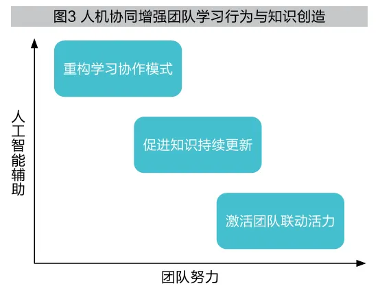人机协同学习为团队知识创造构建了全新协作范式(见图3)。首先,人机协同学习重构了团队协作结构。人类成员善于理解情境、判断价值和构思创意,而AI系统在数据分析、模式识别和流程优化等方面表现卓越,这种互补能够让成员真正“扬长避短”。同时,AI的客观计算和人类的主观经验可以互相验证,让团队决策更全面。