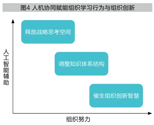 人机协同学习深度赋能组织创新,为现代组织数智化发展提供了变革路径(见图4)。首先,人机协同学习重塑了组织学习的价值创造逻辑。组织成员擅长把握战略方向、传承企业文化、做出复杂决策,AI智能系统则更擅长从海量数据中提取知识、优化业务流程、预测未来趋势。组织使用AI处理基础性的知识管理和信息分发工作,让员工能集中精力思考战略问题。这样既保持了企业原有战略方向,又加入了数据驱动的科学方法,往往能产生突破性解决方案。