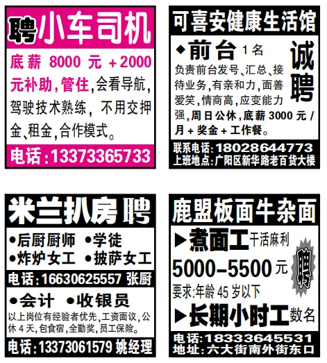 迪聪商贸聘:酒水饮料送货工,月薪5500元;酒水饮料业务员,月薪5000元起。电话:15128697437