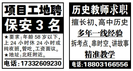 牛老五驴肉火烧聘:夹肉工,50岁以下,工作时间早晨6:00-下午2:00,下午4:30-晚8:00,月薪5800元。电话:13503263539