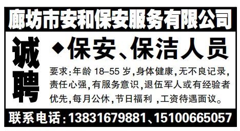东来顺廊坊店聘:服务员若干名,传菜生若干名,收银员2名,刨肉师傅2名,粘板2名。地址:广阳道与银河路交叉口处,沧州银行正对面。电话:18630691036(代店长)
