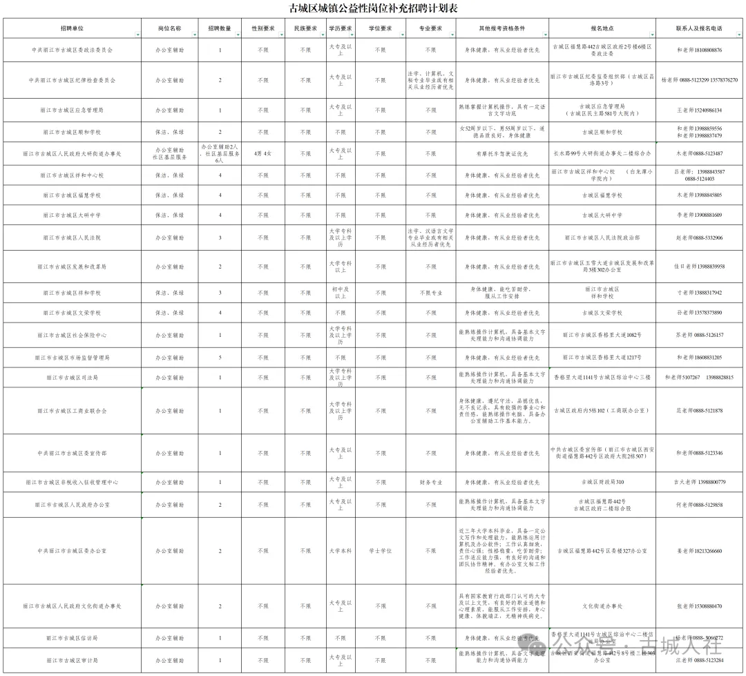 本次招聘全程由丽江市古城区公共就业和人才服务中心进行复审、监督(办公地址:丽江市古城区香格里大道1082号;联系电话:0888-5109288)。
