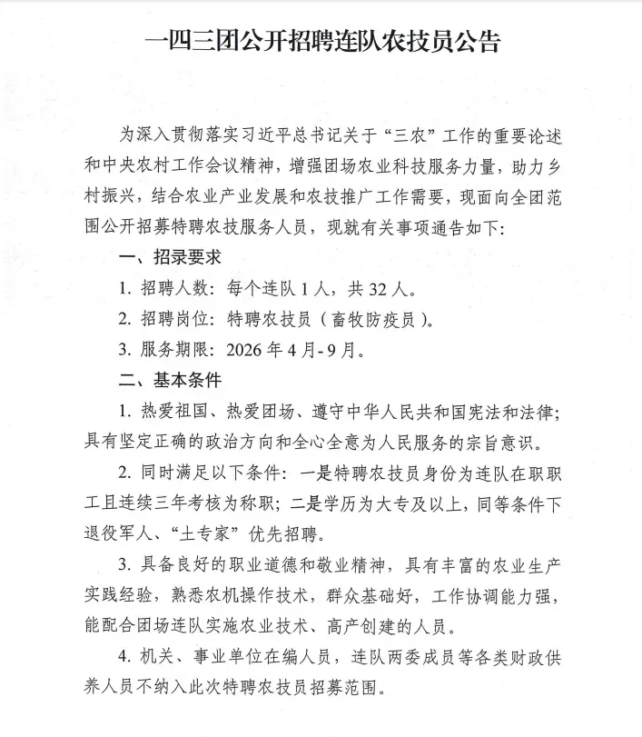 一四三团公开招聘32名连队农技员公告