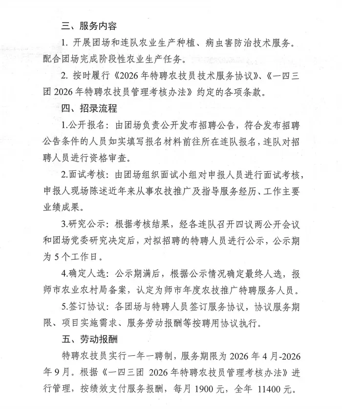 特聘农技员实行一年一聘制,本次聘用人员服务期限为2026年4月至2026年9月。根据《石总场2026年特聘农技员管理考核办法》进行管理,按绩效支付服务报酬。每月2000元,全年12000元。
