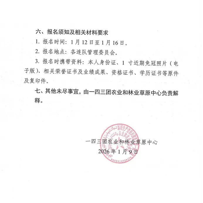 4.确定人选及公示:石总场农业和林业草原中心对报名人员进行审核后,将拟确定人员上报团场研究决定。对最终确定的人员进行公示,公示期为5个工作日;