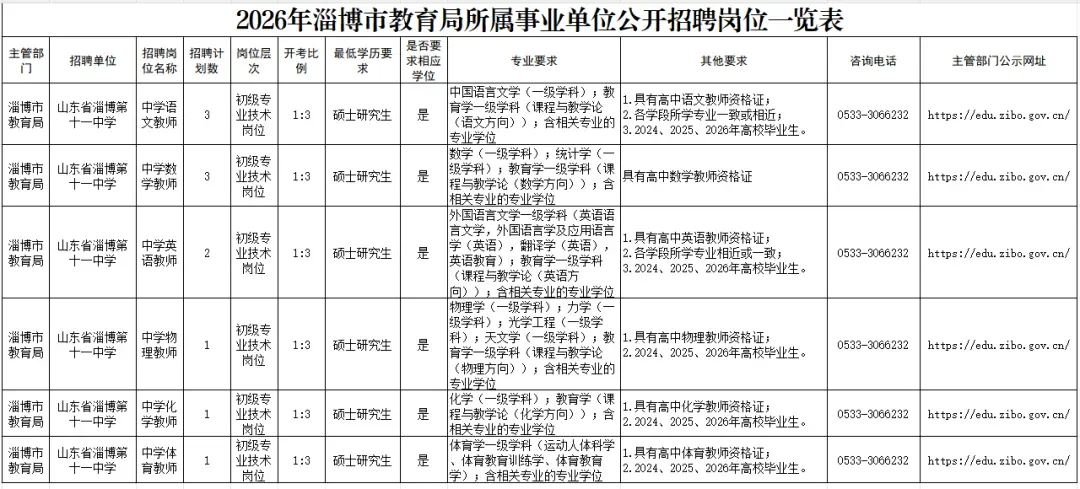 根据事业单位公开招聘有关规定,结合山东省淄博第十一中学岗位空缺情况和工作需要,现将2026年度山东省淄博第十一中学面向社会公开招聘工作人员的有关事项公告如下: