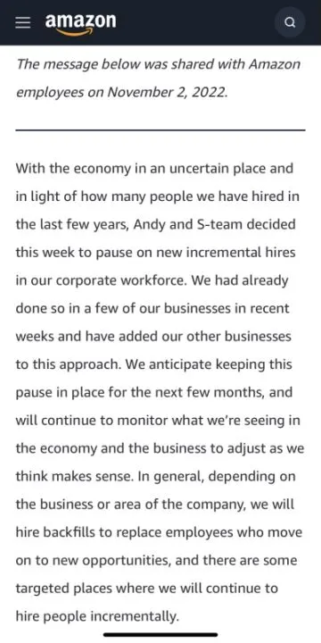 苹果在11月2日被爆出冻结招聘,冻结时间将从当前延续到2023年9月。亚马逊也在10月份相继暂停云业务、零售与物流业务的招聘后,于11月初宣布暂停全公司的招聘。人力资源高级副总裁贝丝·加莱蒂称,亚马逊将在未来几个月中保持暂停招聘状态。