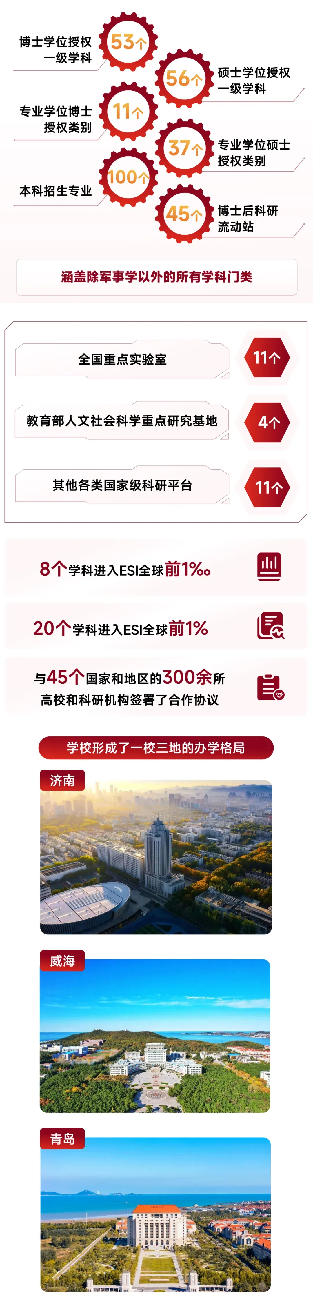 山东大学是一所历史悠久、学科齐全、实力雄厚、特色鲜明的教育部直属重点综合性大学,在国内外具有重要影响。学校是中国学科门类最齐全的大学之一,在综合性大学中具有代表性。