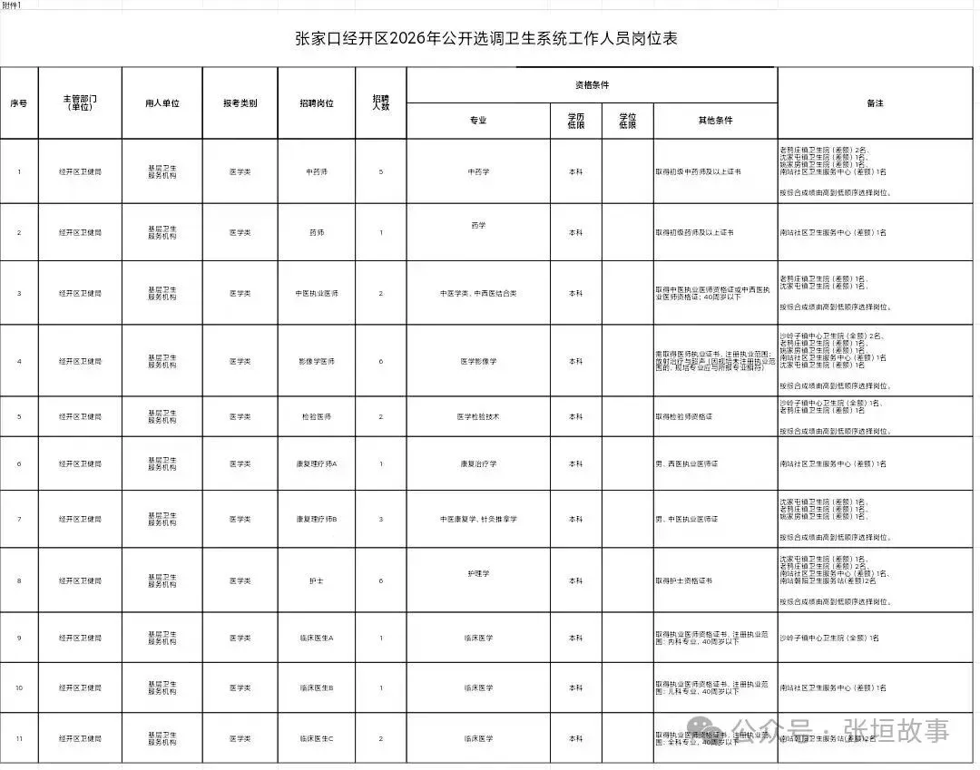 2026年经开区选调卫生系统工作人员30名。具体岗位、人数、条件等详见《张家口经开区2026年公开选调卫生系统工作人员岗位表》(附件1)。