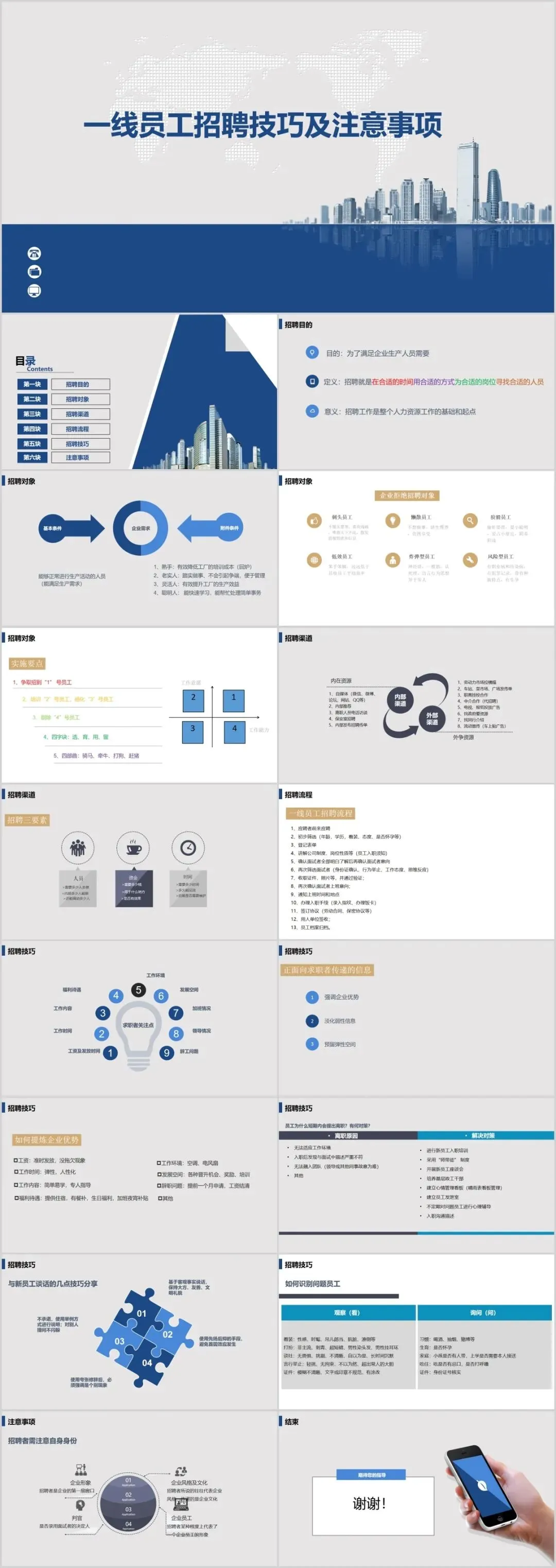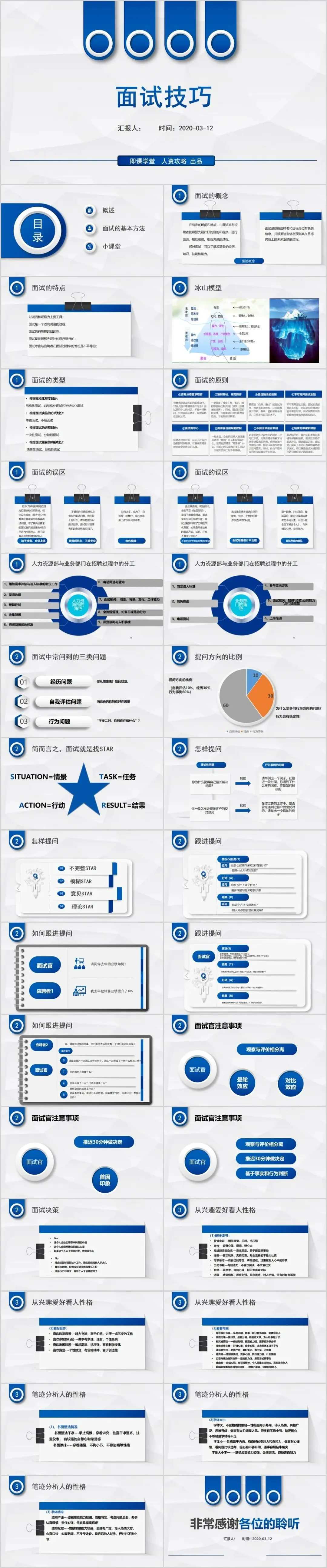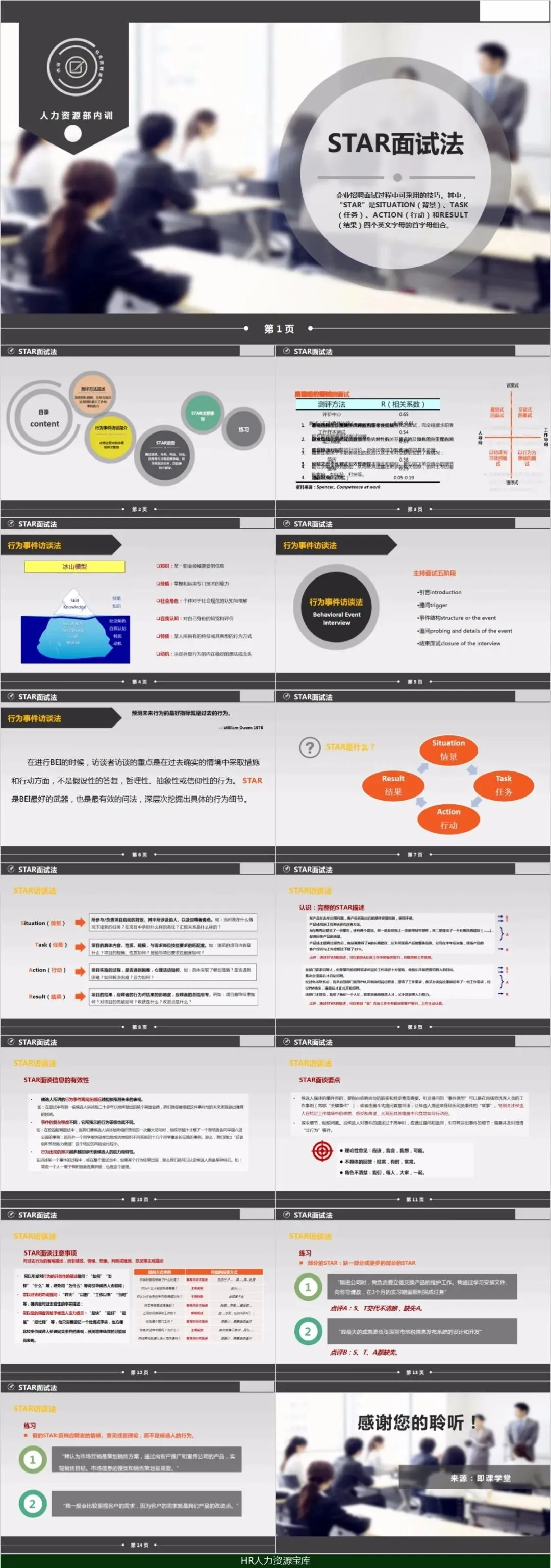 15套面试技巧PPT,制作精美,内容完整,适合自学,以及人力资源部内部培训使用,部分PPT截图展示如下: