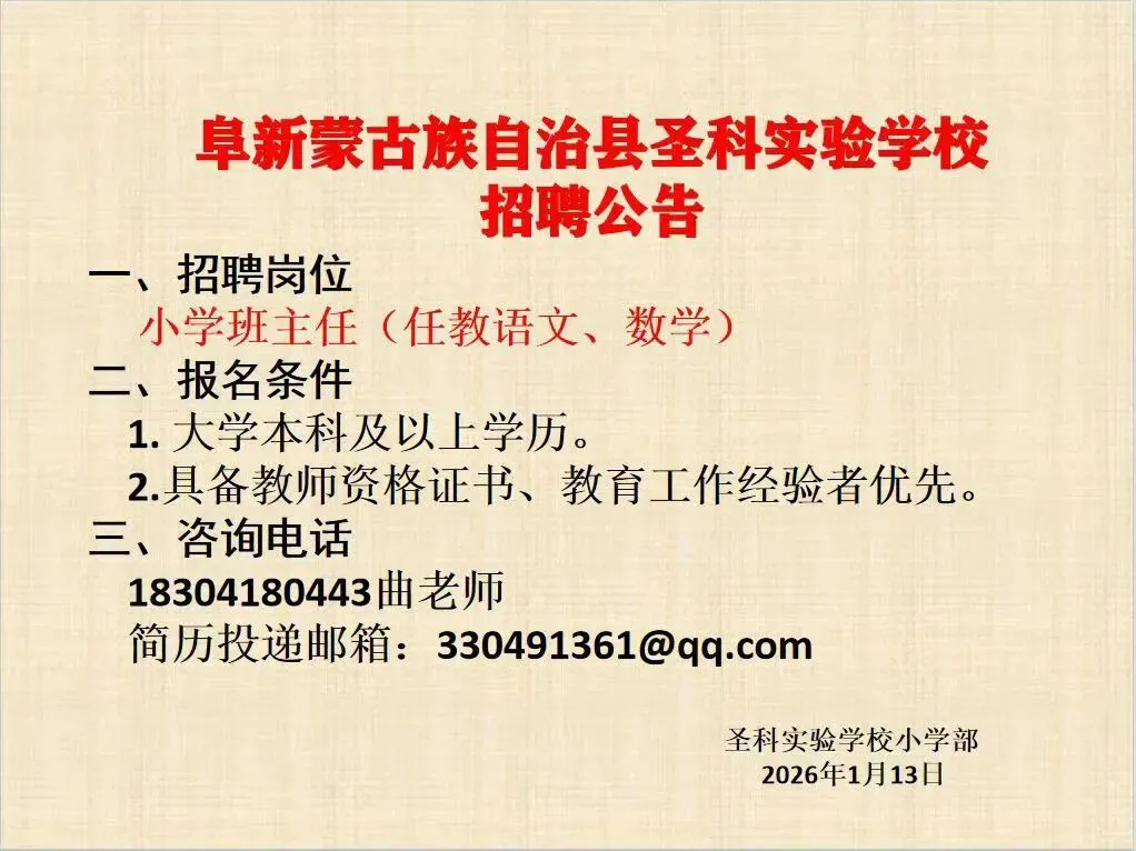 阜新蒙古族自治县圣科实验学校现面向社会诚聘小学班主任(任教语文、数学),期待有教育热情、有经验的你,与我们一同点亮孩子的成长之路。