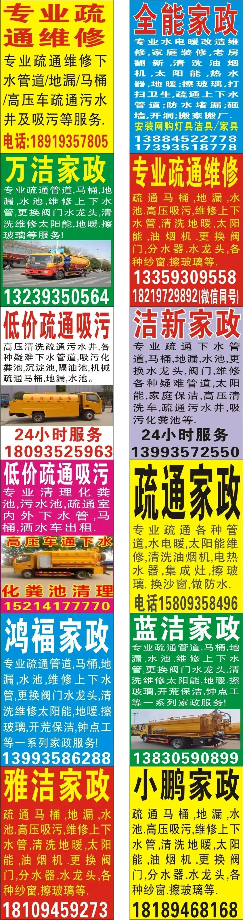 专业疏通各种管道,水电暖,太阳能维修,清洗油烟机,电热水器,集成灶,擦玻璃,换纱窗,做防水。