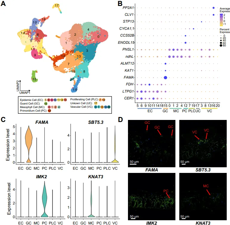 马铃薯是具有重要营养和经济价值的全球性粮食作物。热胁迫显著抑制马铃薯植株生长与块茎发育,制约着马铃薯产业的可持续发展。本研究通过单细胞转录组测序技术描绘了首个马铃薯叶片在热胁迫下的单细胞转录图谱,鉴定了21个细胞簇和6种主要细胞类型,并在异质性细胞群中发现了马铃薯的全新细胞类型特异性标记基因。通过单细胞拟时分析发现表皮细胞是热应激响应的关键细胞类型,其差异表达基因数量最多;而维管细胞位于伪时间轨迹的过渡区,可能参与细胞分化过程。